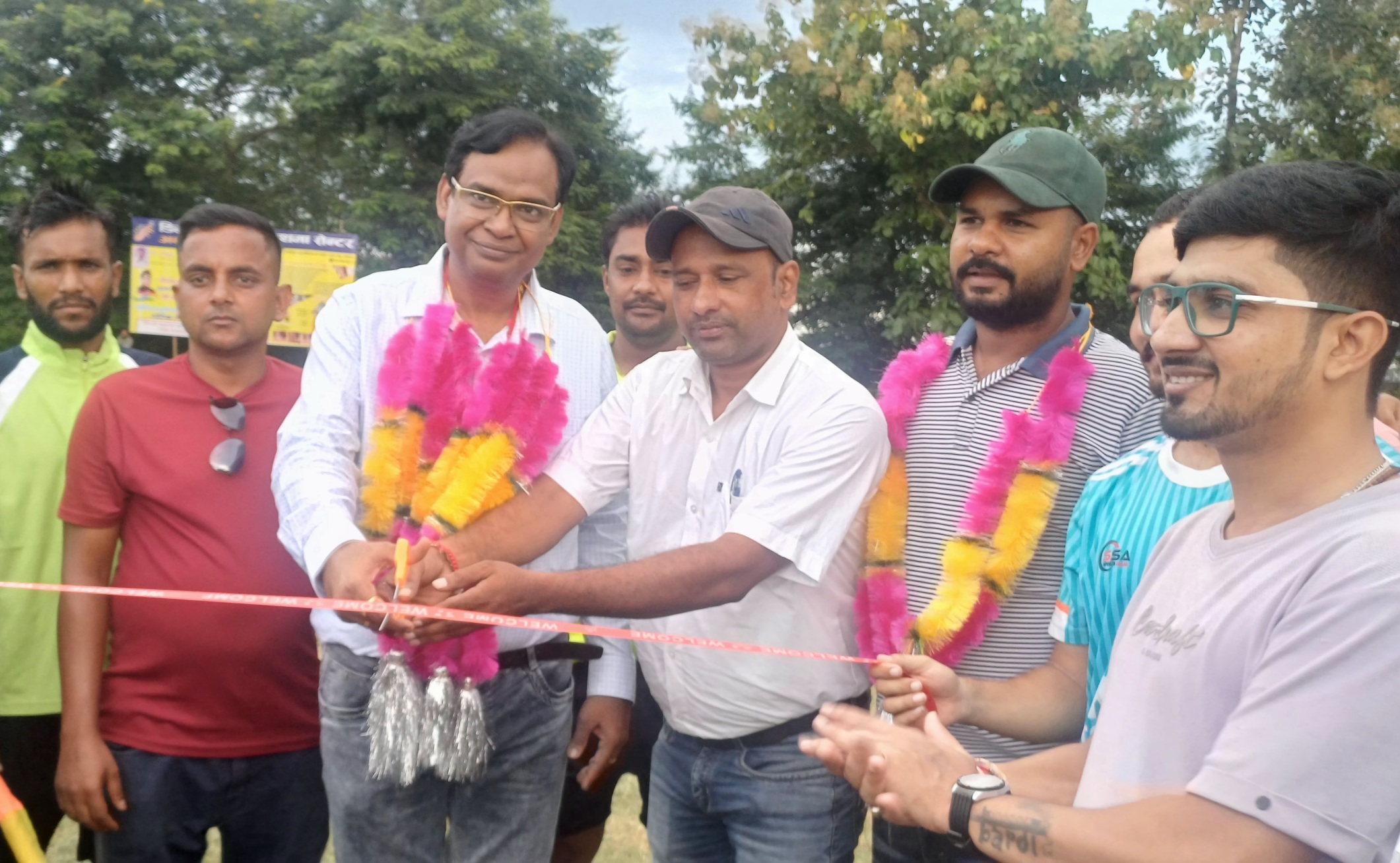 डॉ. दीपक गंगवार मैदान में फीता काटकर नेताजी सुभाष कप-2025 सेमीफाइनल की शुरुआत करते हुए