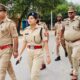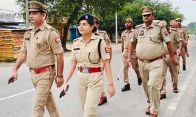 कस्बा न्यूरिया में फ्लैग मार्च करतीं प्रशिक्षु सीओ एवं थाना प्रभारी गायत्री यादव