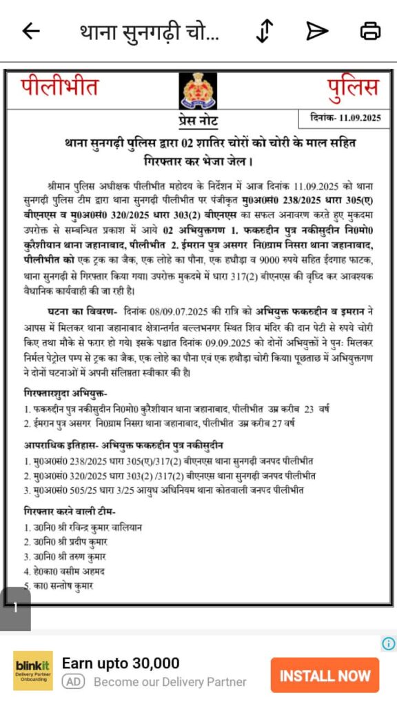 पीलीभीत। थाना सुनगढ़ी पुलिस ने चोरी की घटनाओं में शामिल दो शातिर चोरों को चोरी के सामान सहित गिरफ्तार कर जेल भेज दिया है। पुलिस अधीक्षक पीलीभीत के निर्देशन में की गई इस कार्रवाई में गिरफ्तार अभियुक्तों की पहचान फकरुदीन पुत्र नकीबुद्दीन निवासी कुरेशियान थाना जहानाबाद और इमरान पुत्र असगर निवासी निसरा थाना जहानाबाद के रूप में हुई है।पुलिस ने इनके कब्जे से एक बाइक, लोटा, पीतल का, एक हथौड़ा, 9,000 रुपये नकद, कपड़े और अन्य सामान बरामद किया है। थाना सुनगढ़ी में इनके विरुद्ध आवश्यक धाराओं में मुकदमा दर्ज कर चालान कर दिया गया। जानकारी के अनुसार, दोनों अभियुक्तों ने 08/09 जुलाई 2025 की रात बलरामनगर स्थित शिव मंदिर की दान पेटी तोड़कर चोरी की थी। इसके अलावा 09 सितम्बर को ट्रक का टूल बॉक्स तोड़कर नकदी और सामान चुराया। पूछताछ में दोनों ने अपनी संलिप्तता स्वीकार कर ली।गिरफ्तारी करने वाली पुलिस टीम में उपनिरीक्षक रविंद्र कुमार वालियान, प्रदीप कुमार और तरुण कुमार के आलावा हेड कांस्टेबल वसीम अहमद, कांस्टेबल संतोष कुमार शामिल रहे। पुलिस ने बताया कि दोनों पर पहले से भी आपराधिक मुकदमे दर्ज हैं।